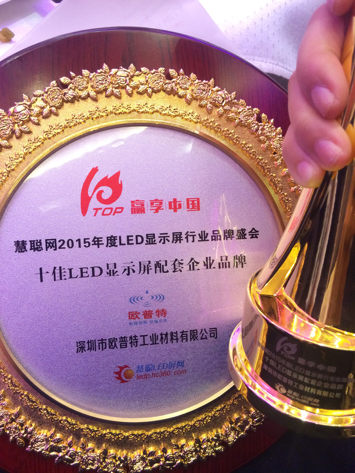 贏享中國.強(qiáng)力巨彩杯2015年LED顯示屏行業(yè)高峰論壇暨頒獎(jiǎng)盛典12月15日在深圳西麗麒麟山莊順利召開。恭喜得獎(jiǎng)的各位行業(yè)大伽及企業(yè),同時(shí)也恭喜深圳歐普特工業(yè)材料有限公司獲得十佳LED顯示屏配套企業(yè)品牌