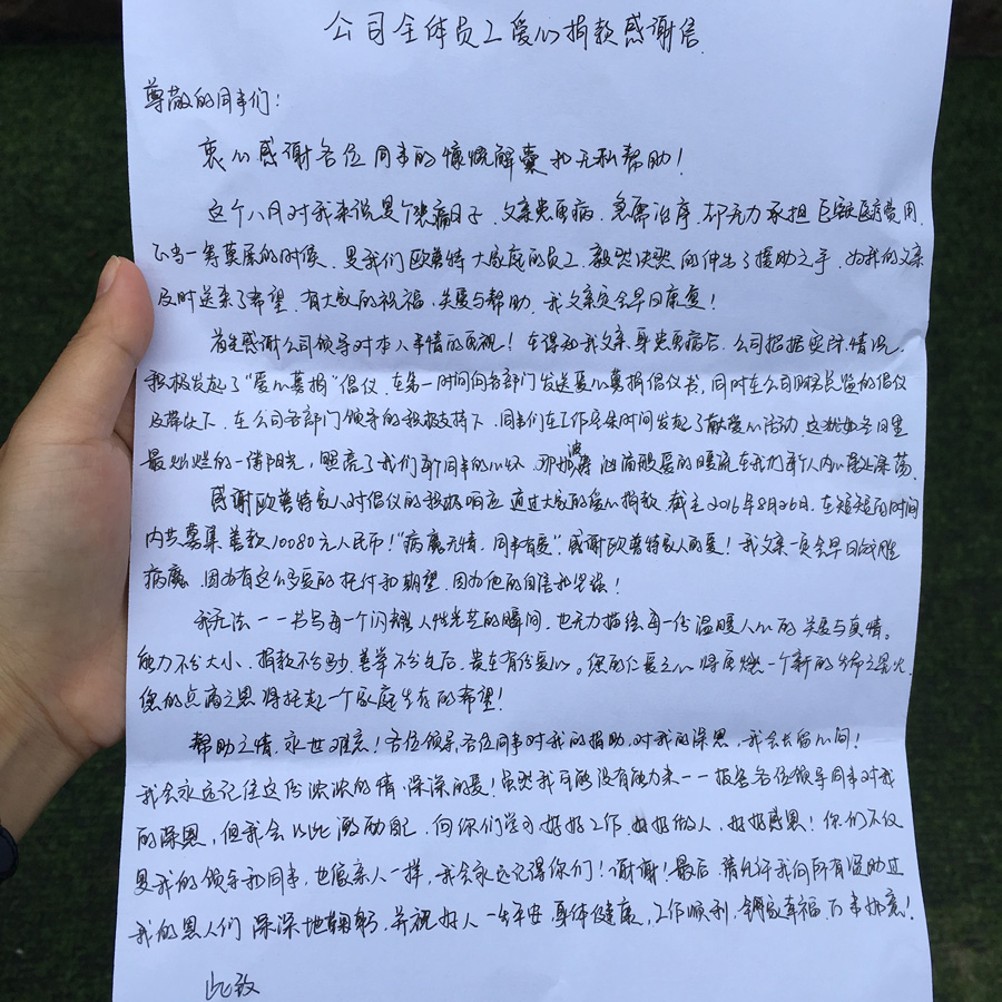 在8月18日,歐普特員工戴蘇梅的父親被檢查患雙腿骨頭壞死晚期,雖然及時住院治療,但對于一位應(yīng)屆畢業(yè)生及一個農(nóng)村家庭來說,醫(yī)治期間的費(fèi)用數(shù)額實(shí)在無力承擔(dān)。挽救生命刻不容緩,身為歐普特大家庭的一員,歐普特同仁及時組織愛心捐款,截止8月26日10時共籌善款27742.6元,希望這些善款能幫助她的家庭渡過難關(guān)。一筆筆愛心捐款,承載著歐普特領(lǐng)導(dǎo)及員工的關(guān)愛,展現(xiàn)著歐普特同仁的溫情與大愛,我們相信,這份點(diǎn)滴之愛匯成的暖流,將會傳遞生命的熱度,讓這個家庭看到希望的曙光,感受到歐普特大家庭的陣陣溫暖。