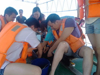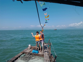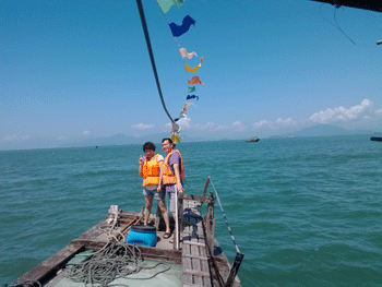 第二天,公司又組了海上捕魚(yú)活動(dòng),,于是我們?cè)僖淮翁ど蠞O船,享受著大海的擁抱和飄逸的海風(fēng),讓我們每一根神經(jīng)都放松到了極點(diǎn),這時(shí),膽大的兩位同事還在船頭上演了一段"朱麗葉和羅密歐".