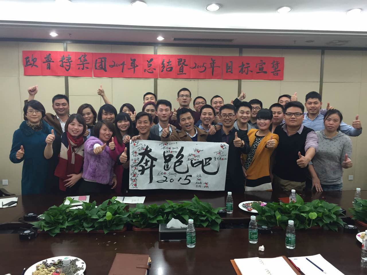 激動(dòng)人心的目標(biāo)宣誓環(huán)節(jié)終于來了,在激昂雄壯的音樂下,首先由光電一部鄭經(jīng)理簽字畫押了1200萬(wàn)的個(gè)人業(yè)績(jī)承諾,然后每一個(gè)同事都簽下了自己的目標(biāo),并按上了一個(gè)個(gè)鮮紅的手指印,宣讀自己豪邁的承諾-----有承諾未完成目標(biāo)裸奔的,也有承諾完成任務(wù)后請(qǐng)大家寶利來旋轉(zhuǎn)餐廳自助餐的。2015年大家都在努力逼自己改變,去實(shí)現(xiàn)自己更遠(yuǎn)大的夢(mèng)想。幾十個(gè)兄弟姐妹的夢(mèng)想就像一條條娟娟溪流匯成大海,凝聚成歐普特集團(tuán)2015年?duì)I銷戰(zhàn)略,由蘇立輝揮毫潑墨取名“奔跑吧2015”。