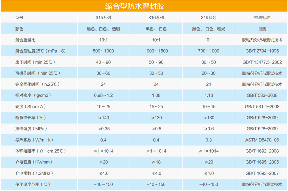 用于電子元器件的粘接、密封和封裝保護(hù),固化后可以起到防水、防潮、防塵、絕緣、導(dǎo)熱、密封、防腐蝕、耐溫、防震等作用,能提高電子電器元件使用性能,強(qiáng)化電子器件的整體性,提高對(duì)外來沖擊、震動(dòng)的抵抗力,提高內(nèi)部元件、線路間絕緣性。